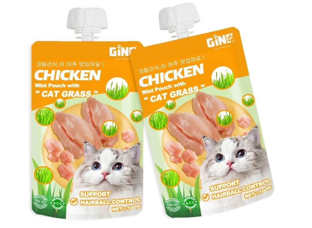 GINO CHICKEN WITH CAT GRASS CAT TREATS-POUCH 100G HAIRBALL CONTROL