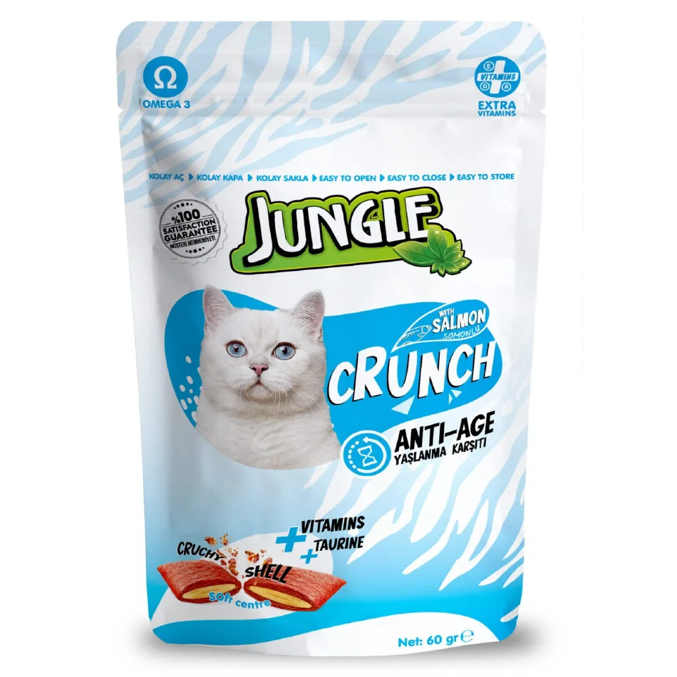 Jungle Crunch Dry Cat Treat Anti-Age with Salmon 60gmJungle Crunch is the World Class Super Premium Quality Dry Treats For Your Cats Intended for Supplementary Feeding and Occasional Reward. Outer Shell is Scrumptiously Crunchy and Inner Layer is Deliciously Soft and Tasty. The Treat is so Tasty that it Makes Your Cat Crazy Like Ever!! As Made in Turkey, It Ensures Premium European Quality Standard. Jungle is Turkey’s Number #1 Selling Brand. It’s the Most Premium Dry Cat Treat Available in the Country. Every Lip-Licking Crunchy Bite Lets Your Cat Know Loud and Clear – It’s Time to Party! Feed Your Cat 2 Treats for Each 1 Pound of Body Weight, Not to Exceed up to 10 Treats Daily As A Reward or Tasty Snack. Jungle Crunch Dry Treat Provides Plaque Protection and Ensures Fresh Breath. Collagen Care Formula Ensures Healthy Skin and Beautiful Fur. Included Prebiotics Ensures Good Digestion and Glucosamine Ensures Good Joints. Taurine Helps Increasing Eyesight and Vitamin C & E Ensures Strong Immunity. Jungle Dry Treats Indulge Your Kitty in Eternal Happiness and Unlimited Enjoyment. Jungle Crunch Dry Cat Treat Makes Your Cats Crazy with Mouthwatering Taste.