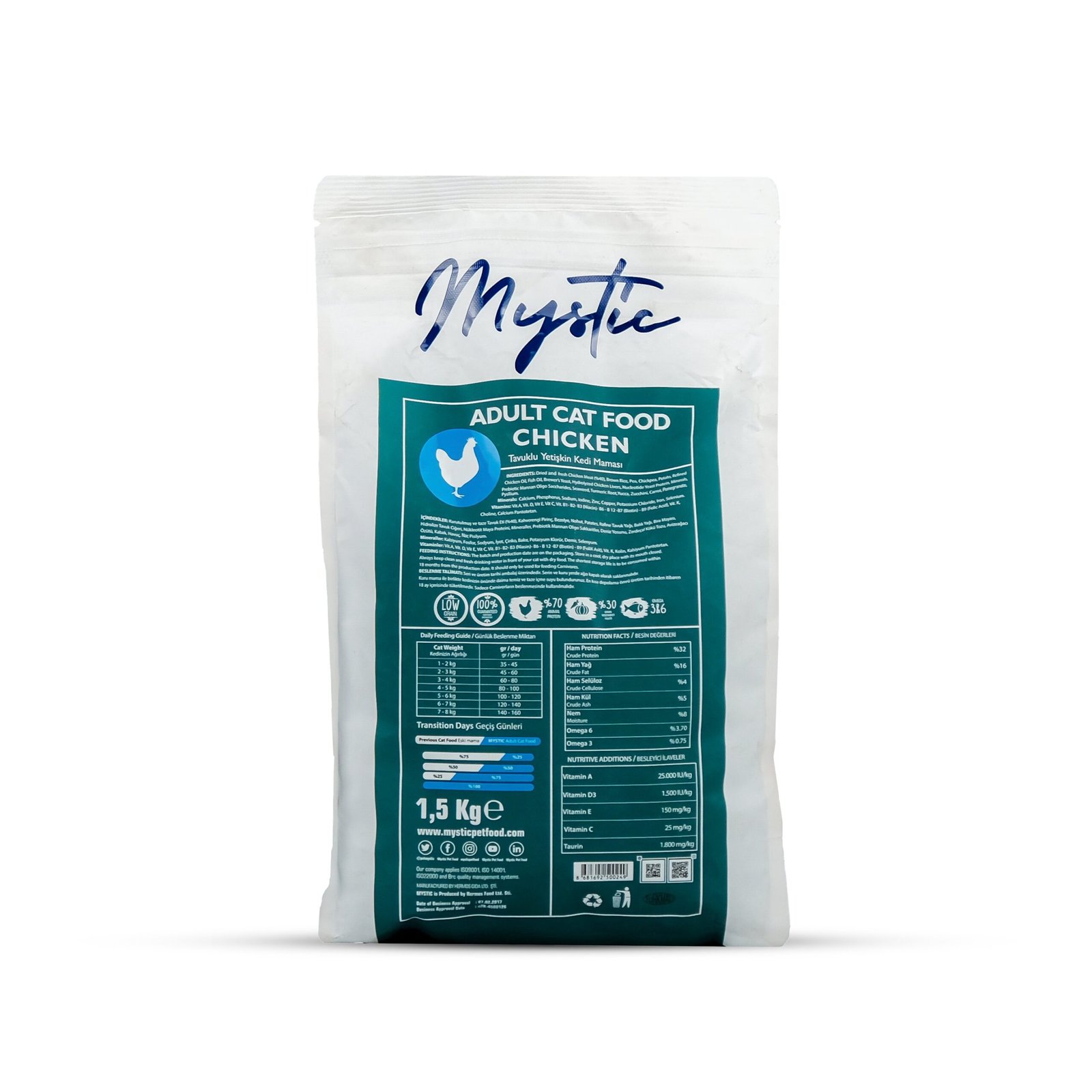 Mystic Low Grain Cat Food is the Complete & Balanced Nutrition for Your Cat. Mystic is Currently One of the Best Food Available in Bangladeshi Market. As Made in Turkey, Mystic Maintains Pure European Quality Standard. Mystic is LOW GRAIN Catfood which Means Mytic Includes No Grains as Ingredient. It Has NO CORN, NO SOYABEAN, NO RICE, NO POTATO, NO WHEAT. Even, It doesnt Have any Genetically Modified (GMO) Products. NO COLOUR is Added, Even NO ARTIFICIAL SWEETNERS, NO CHEMICAL FLAVOURINGS are Added. Truely, It will be the Best Feeding Experience for Your Cats. MYSTIC Includes 70% Animal Protein and is Produced Using Liquefied Fresh Meat Injection System (FMIS). This Delicious Meal Providing 100% of All Essential Nutrients that Cats Need to Grow Healthy and Strong. Made with Best Quality Ingredients Sourced from Nature. Made of Quality Meat & Fish to Provide Amino Acids to Maintain Good Muscle Mass by Giving HIGHEST PROTEIN. Optimum Fat Ensures High Energy and Essential Fatty Acids Maintain Healthy Skin and Shiny Coat. All Necessary Vitamins for Body Functions and Enhancement of the Immune system are Included. All Necessary Minerals for Body Functions and Strengthen Bones and Teeth are Included. Added Omega 3 & 6 Ensure Shiny & Beautiful Coat & Healty Skin. Extra Probiotics & Prebiotics Help Boosting Immunity. Taurine Plus Ensures Proper Eye & Brain Function. It’s HYPOALLERGENIC which means Mystic Causes NO ALLERGIC REACTION to your Cat’s Skin. Mytic’s Improved Digest Care Technology Ensures That Food is Very Easy to Digest for Your Cat.