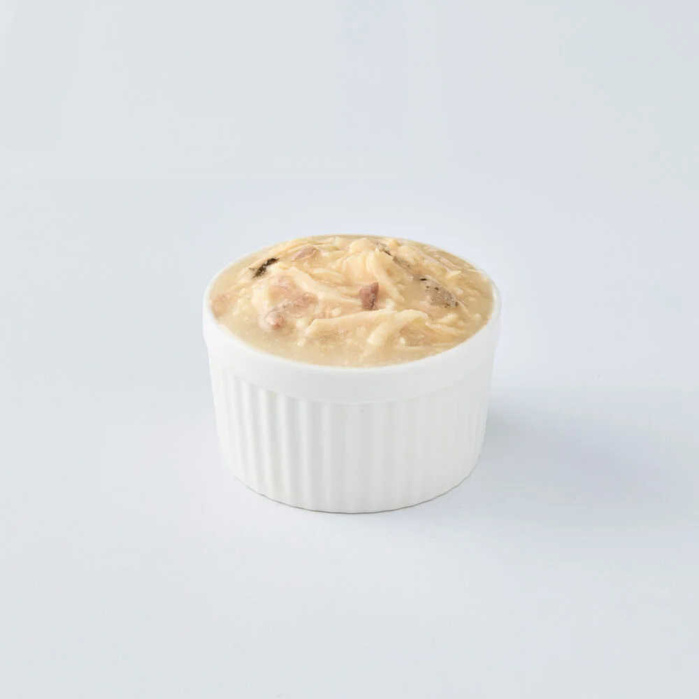 The ingredients of this cat food include Tuna, Chicken (Sasami), Jelly powder, Enhancer, Prebiotic (Fructooligosaccharides), Vitamin E, Taurine, and Fish oil. These ingredients contribute to a well-balanced and nutritious meal for cats.